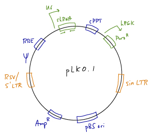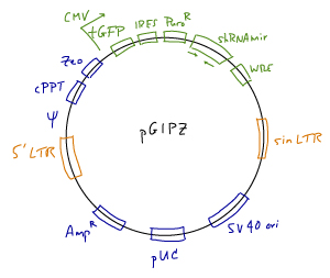 • Vector: pGIPZ lentiviral vector. Details are available at the Open Biosystems website; a vector map and sequence are available here.